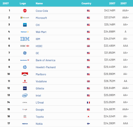 英特尔近几年经历了一段艰难的时期:AMD复苏,失去主要客户(最主要是苹果),14纳米制程供应问题,10纳米制程工艺失败,无法在移动市场建立店铺,出售调制解调器业务的决定以及重大的政府改革。但是,鉴于该公司在客户端和服务器领域的强劲表现,英特尔还是能在很大程度上弥补这些持续的失败。不过,如果有人看一下Intel年来公司的估值,或许会惊叹其原来退步了这么多。今天,首先让我们看看英特尔多年来在品牌财务排名中的位置:
