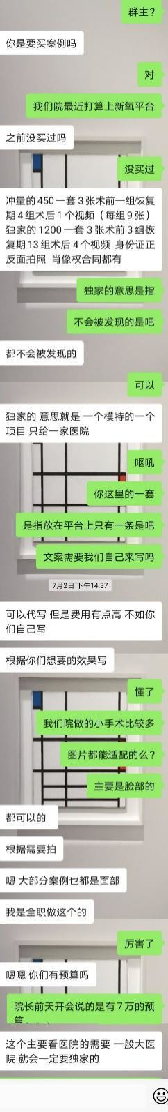 据业内人士透露,从各种渠道购买假案例、假日记的“刷单”现象在新氧平台上屡见不鲜。《投资者网》以整形医院工作人员的身份,通过QQ群认识了一位医美假案例卖家。他声称自己是职业卖家,做这一行已有3年,无论大小整形机构都与他有“生意”往来。谈话中,当问及假案例的类型以及价格的时候,他诧异地反问:“你们以前没买过?”