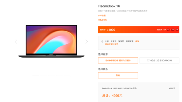 RedmiBook 16英特尔处理器版本发售:4999元起