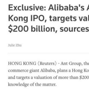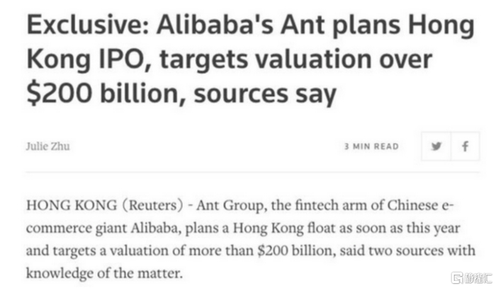 根据路透社援引两名知情人士消息称,阿里巴巴旗下蚂蚁金服计划最快今年在香港上市,目标估值超过2000亿美元。其中一位消息人士称,蚂蚁金服正在考虑在IPO中出售5%~10%的股份,这也将是今年全球规模最大的IPO之一。这些消息人士还补充称,蚂蚁金服一直在与其顾问就计划中的上市计划进行合作,但他们警告称,具体的细节并未敲定,最终可能发生变化。