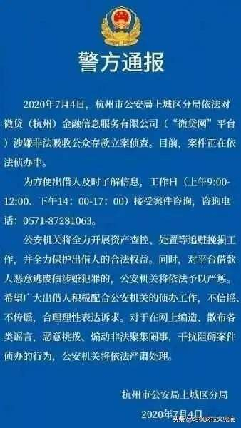 7月4日深夜,杭州下雨了,闷热的天气得以缓解,警方也是因势利导,发布了一条让千万负债人高兴的好消息,号称浙江最大的网贷平台,美国纳斯达克上市公司,微贷网已经正式被刑事立案侦查,涉嫌“非法吸收公众存款”。