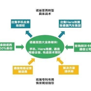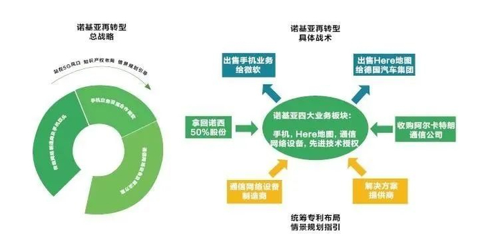 战略是抛弃手机业务再转型通信业务,战术上诺基亚也制定了一系列完备的措施。2013年,诺基亚将手机业务出售给微软,之后又进行了上万人的大规模裁员。为了进一步精简业务,诺基亚又在2015年将Here地图业务出售给奔驰、奥迪、宝马等公司组成的德国汽车巨头集团,以保证公司新的发展方向能轻装上阵。与此同时,诺基亚先拿回了诺基亚西门子合作的50%股份,又宣布以166亿美元收购全球主流通信设备商阿尔卡特通信公司。这一系列举措被看作是诺基亚专注通信网络设备及解决方案的最后冲刺,也可以看出诺基亚终于依依不舍地砍掉手机业务,投入通信网络设备及解决方案的决心。