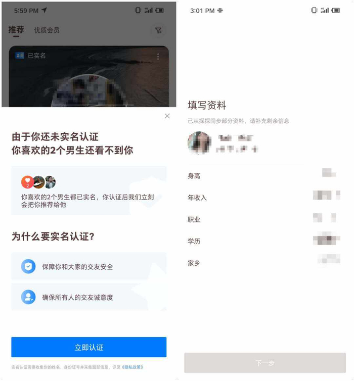 经实测,这款App与探探有着明显的不同,除了必须认真填写资料以外,还必须通过实名认证才可以发起“喜欢”,匹配成功。据蝉大师数据,目前“牵手”再iOS社交免费榜排在第66名,距离头部“珍爱网”也只差了20多名。另外,还有站在巨头肩膀上的“她说”。从微信小程序做起,用微信社交圈人,采用女生提问男生回答的方式破冰,并在2019年底正式上架App,据官方说法已促成了近200,000次的匹配,男生回答问题的总字数近5000万,相当于166本30万字的书籍。网易若不继续发力,很容易被对手取代。