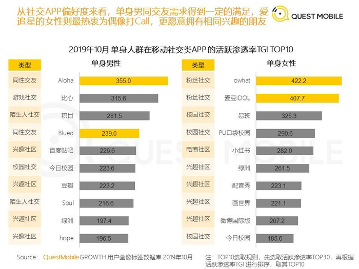 从QuestMobile统计2019年10月统计的社交偏好来看,含蓄的中国单身人们还是更喜欢兴趣社交,主打陌生社交的软件上榜率就很少。即使是主打陌生设计的软件里,比起目的较为明显的“他趣”和“探探”,更有温度的积目和犹抱琵琶半遮面的Soul更受人欢迎。这大概也是陌陌的月活量徘徊不前,Soul的月活量快速增长的原因之一。