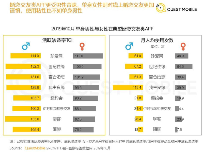 不仅如此,由于对于单身人士来说,一人吃饱就等于养活全家,这一群人更舍得花钱。据QuestMobile 2019年10月的数据,不论是线上消费的意愿,还是线上消费的能力,单身人士都比移动互联网平均水平要强。并且这群人,也越来越舍得在社交App上花钱,据App Annie统计的数据,在2019年一整年,交友类 App 的全球用户支出达到了22亿美元,与2年前相比翻了一倍。