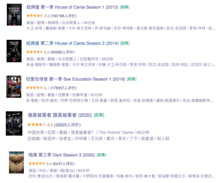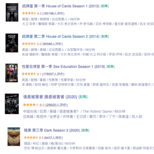 从加拿大到欧洲再到亚洲市场,Netflix剧遍及全球,且口碑和热度都一路飙升。Netflix出品的政治题材剧《纸牌屋》前两季皆是9.2的高分;《性爱自修室》第一季评分9.1,第二季评分9.0;第一部德剧《暗黑》第三季评分高达9.4;就算布局台剧《谁是被害者》也获得了8.0的良好口碑。