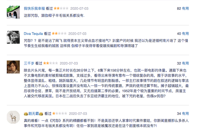 网友们似乎都在抱怨剧集过于追求噱头和社会性,完全没有必要改编《咒怨》,因为这个故事无论是套用午夜凶铃、富江还是金田一实际上都是适用的。