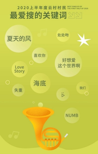 这份榜单还总结了2020年上半年云村用户最爱搜的关键词,“夏天的风、喜欢你、我们、处处吻、Love Story、失重、海底、好想爱这个世界啊……”,这些词组连起来就像是一曲温柔的音乐,治愈了我们的不安和忐忑,也希望这份音乐的力量,能伴随着我们走过未来的每一天。