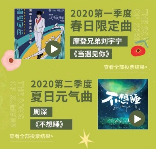 此外,摩登兄弟刘宇宁《当遇见你》和周深《不想睡》分别获得2020第一季度春日限定曲和第二季度夏日元气曲。