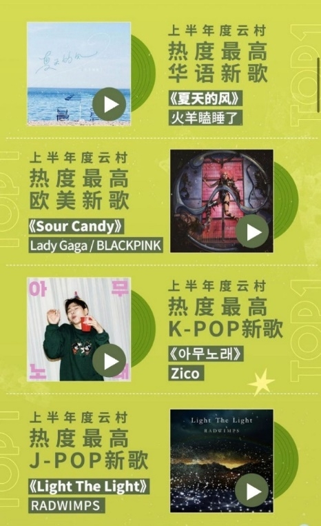 近日,网易云音乐发布2020上半年音乐榜单出炉,盘点过去半年来发行的最热门音乐作品。毛不易《小王》成为上半年最热华语专辑和全站最热专辑,火羊瞌睡了《夏天的风》、Lady Gaga / BLACKPINK《Sour Candy》、Zico《아무노래》、RADWIMPS《Light The Light》分获上半年云村最热华语、欧美、K-POP、J-POP新歌。