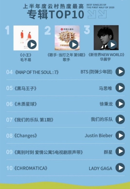 分众化、多元化的音乐风格趋势,在这份榜单中体现的淋漓尽致。在上半年云村热度最高的专辑TOP10中,不仅有毛不易《小王》、华晨宇《新世界NEW WORLD》等华语流行音乐,也有BTS (防弹少年团)《MAP OF THE SOUL : 7》、Justin Bieber《Changes》、Lady Gaga《Chromatica》、马思唯《黑马王子》等韩语、欧美、说唱音乐入选。