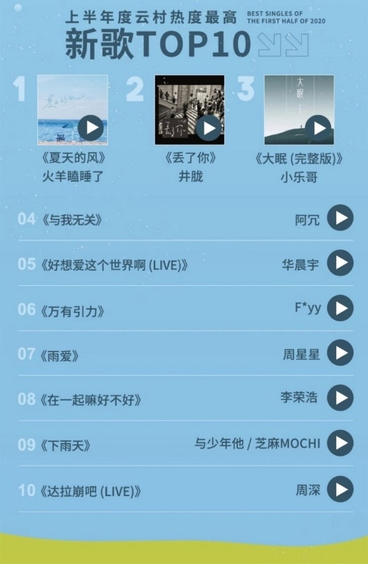 值得注意的是,在网易云音乐2020上半年音乐榜单中,除了新歌之外还有不少华语流行经典歌曲,比如火羊瞌睡了《夏天的风》、周星星《雨爱》、与少年他 / 芝麻Mochi《下雨天》等,分别位列最热新歌第一、第七、第九。