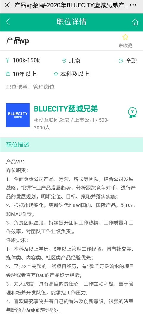 不过,网易财经注意到,在某招聘网站上,BLUECITY蓝城兄弟确实在招聘产品VP,岗位责任与网传图片中的要求部分重合,比如“全面负责公司产品、运营、增长等团队”。这个职位的薪资是100k-150k之间,要求:5年以上管理工作经验,至少2个完整的上线项目经历,有1款千万级流水的项目经验或者百万Dau的产品设计经验等。