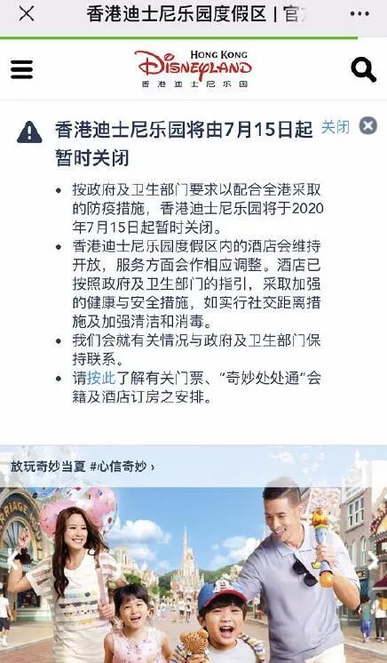 7月14日,香港迪士尼乐园官网发布闭园通知。这意味着,恢复营业不到一个月的香港迪士尼乐园再度关闭。