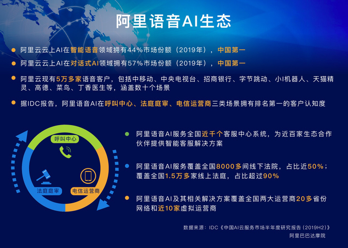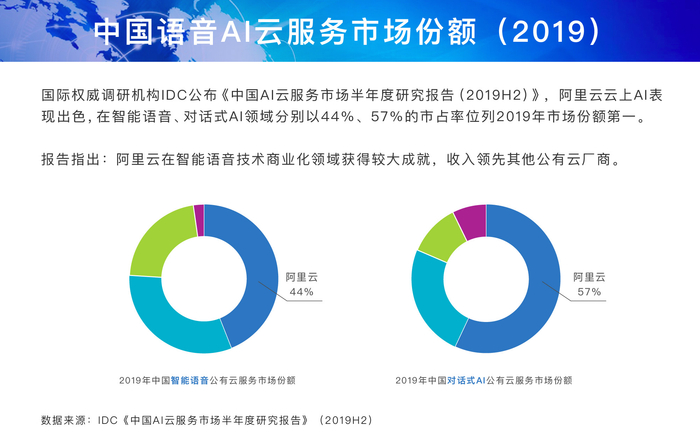 7月14日,国际权威研究机构IDC(国际数据公司)公布《中国AI云服务市场半年度研究报告,2019H2》,阿里语音AI表现突出,2019年以44%的市场份额稳居第一位,大幅领先国内其他云服务厂商。