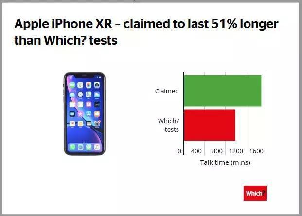 在去年,英国消费者权益组织Which就针对“续航虚报”对苹果发出质疑,他们仔细比对了各类iPhone的使用时间和宣传续航时间,发现所有型号都低于苹果号称的的18%-51%。
