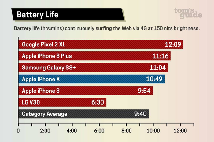 直到全面屏时代来临,苹果进一步压缩主板空间,来给机身放进“L”型电池的时候,iPhone的续航才开始回到续航测试的中间水平。iPhone X在5.8寸的机身下,放进了一块比5.5英寸的iPhone 8 Plus还要大的电池,才勉强吃下了大尺寸全面屏的高耗电。