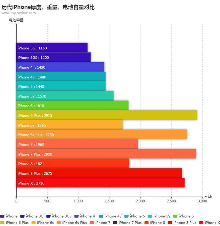 但在之后的四年内,苹果却一直没有对电池容量进行再一次的提升。4.7英寸的iPhone开始在1700—1800mAh的电池容量上打转,Plus系列更是迟迟没有突破3000mAh。同时期的安卓旗舰,则纷纷从3000mAh起飞,来到了4000—4500mAh的阶段。