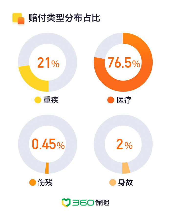 从赔付类型来看,360保险医疗险赔付占比76.5%,件均赔付金额约为6700元。重疾险占比21%,出险用户以41-60岁年龄段及恶性肿瘤人群为主。意外险个人累计最高赔付金额为51万元,摔伤骨折、扭伤是意外险出险常见原因。