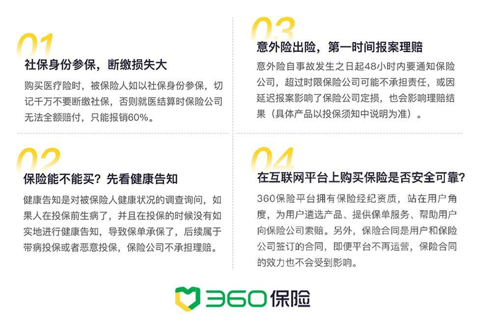 为避免更多人遭遇保险理赔道路上的“坑”,360保险也整理了一份避坑指南,让大家少走弯路。除了以社保身份参保注意不要断缴社保外,投保前仔细阅读健康告知也十分重要。投保人未如实进行健康告知,导致保单承保了,后续属于带病投保或者恶意投保。若不幸发生意外事故,要第一时间通知保险公司,若过时限或因延迟报案影响了保险公司定损,以免影响理赔结果。