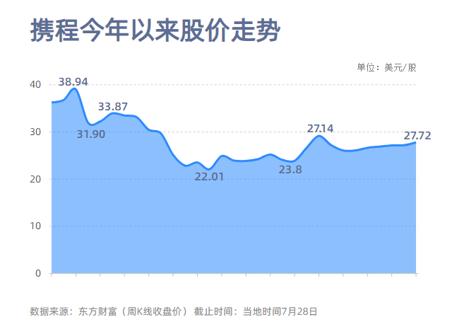 业绩下降,也反映在了携程的股价上。受疫情影响,今年3月18日,携程股价最低曾下探至20.10美元/股。较之这一谷底,目前携程股价已有逾30%的恢复。