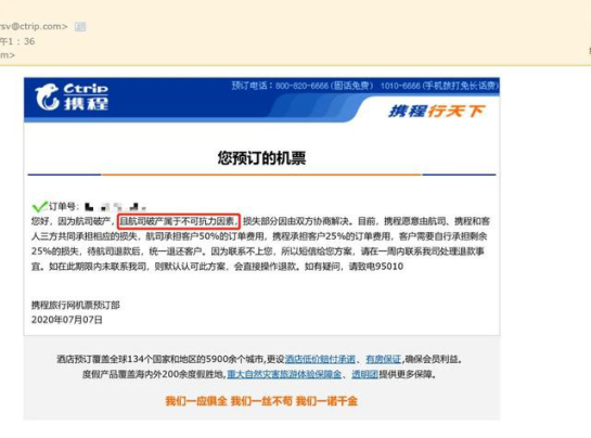 航班取消退款难,携程认为航司倒闭属不可抗力因素