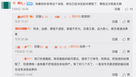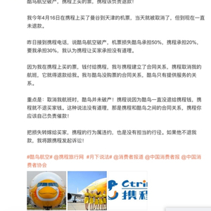 但大部分用户并不对此买账,认为用户在携程上购买的机票,就该由携程负责退款。携程和酷鸟之间的合同关系,不该将损失转嫁给用户。此事引起了不少网友热议,航司破产,损失该由谁承担?