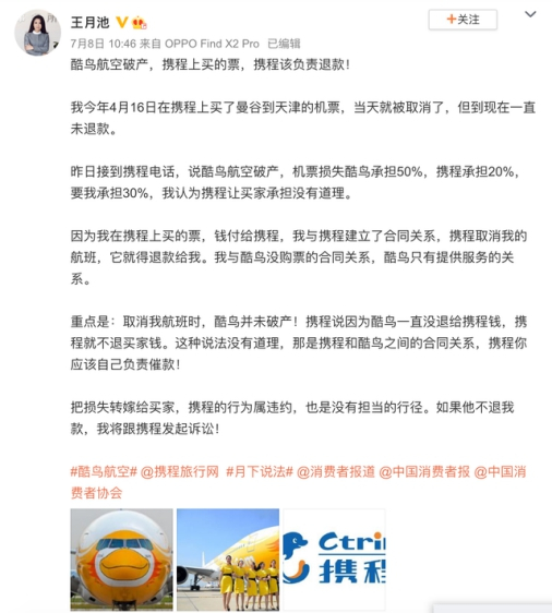 “我和携程说了,我的钱是给了你,我和酷鸟航空是没有关系的,是你携程把钱给到航空公司。我四月份买票的时候他还没有破产呢,你怎么能拖到航空公司破产了才和我说这事呢。”王月池对《消费者报道》说。据了解,泰国酷鸟航空于6月26日宣布破产清算,而王月池于4月16日购买了5月3日的机票。