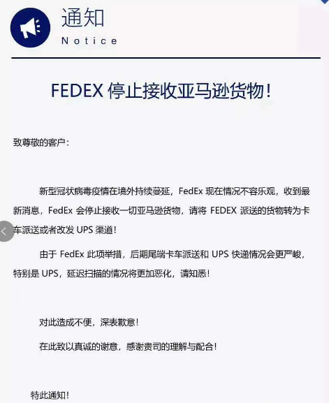 多位货代行业人士透露,已收到消息,FedEx将暂停接收亚马逊货物,要求货代不能再接亚马逊卖家的货物。