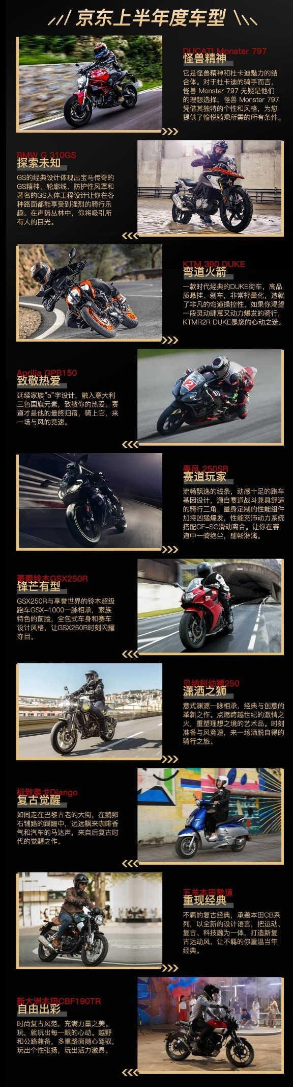 这一点从京东线上摩展页面展示的“京东上半年度车型”也可见一斑:杜卡迪怪兽797、宝马BMW 310GS、KTM 390 DUKE、aprilia GPR150纪念版……无一不是“硬茬子”。而车展首发的贝纳利幼狮800、宝马R18、贝纳利Leoncino 500 Sport等,也都是一等一的“高档货”。这些车型在京东线上摩展中无一例外的引发了大量车友的关注,这表明高端车型未来的市场前景非常乐观。