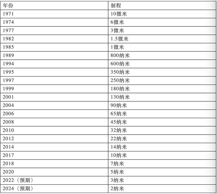 简而言之,摩尔定律预言了芯片指数性发展的规律,从二十世纪七十年代至今,芯片产业的发展基本与这一规律相符。从实现的角度来说,就是芯片的制程不停地进步,从微米一步步地进入到纳米世界。下面的表格给出了芯片制程及引入的年份