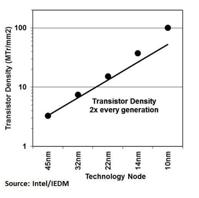 对英特尔来说,成功归功于摩尔定律--直到2014年英特尔都是按照摩尔定律的步调向前进。同样的,英特尔也因摩尔定律而衰。