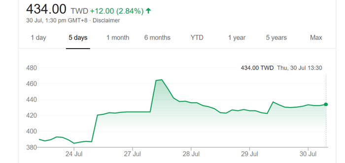 与此同时,台积电的股价大涨:从390新台币涨到了430新台币附近,总市值达到了4300亿美元,超过英特尔的2090亿美元一倍之多。