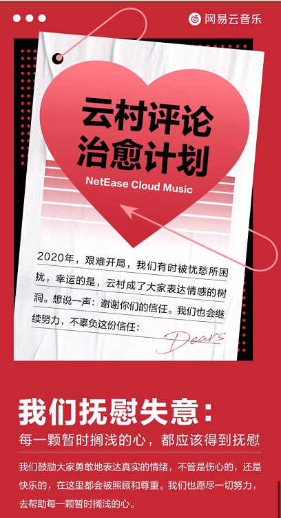 针对“网抑云”现象,8月3日,网易云音乐正式推出“云村评论治愈计划”,推出三大举措, 邀请心理专家、万名心理专业志愿者加入“云村治愈所”,万名乐评达人组成云村乐评团发起乐评征集大赛,一起构建一个温暖友爱音乐社区。同时,升级《云村公约》治理虚假编造内容,规范乐评礼仪,为真正有需要的用户提供专业帮助。