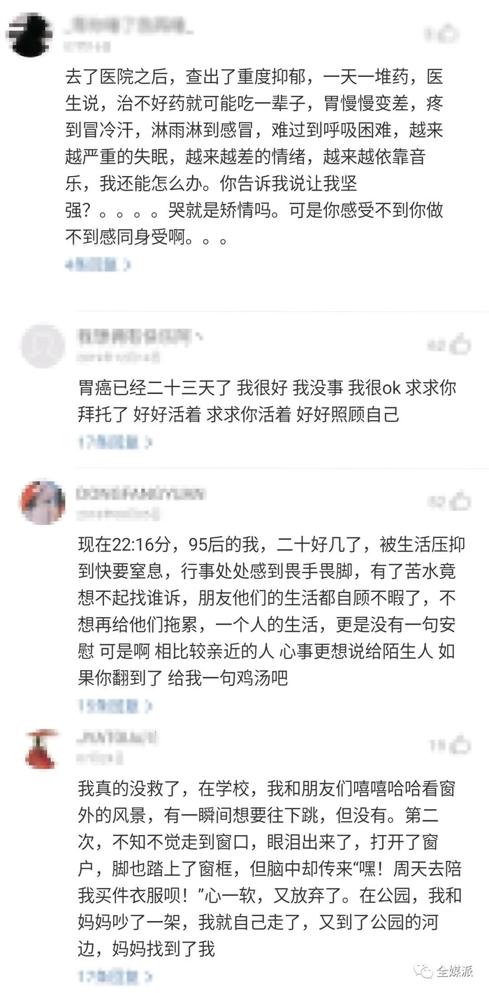 面对悲观情绪的表达,一些跟帖评论的人好像找到了“知己”,也跟着表达自己的负面情绪和内心创伤,这样的“共情效应”可以使自己感到不再“孤独”,“哦,原来别人也有这样的境遇”。但也可能因为情绪上的相互渲染,大家的境况都不好,因而产生更加无助的感觉,这就是病态的“命运共同体”现象。