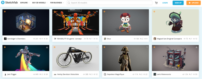 AR.js 提供了一个接口,可以将自己的模型对应到二维码或者图案上。但这里有一个问题:精美的 3D 模型要从哪里找呢?在视频中,Mars 推荐的是一个叫 Sketchfab 的网站。Sketchfab 和普通的图片网站类似,但不同之处在于,上面的模型都是 3D 的,而且大多渲染精良,既有付费模型,也有免费模型。