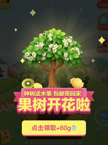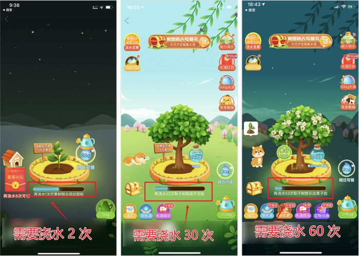 刚开始的时候,用户浇水 2 次就能从种子长成树苗,进入下一阶段。基本上只要做完新手任务,就能升到果树阶段。