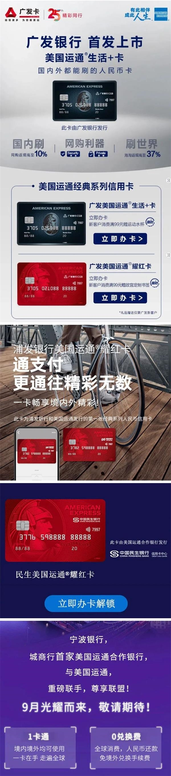 从发行卡种看,广发银行发行了两款,分别是广发美国运通耀红卡、广发美国运通生活+卡;浦发银行发行浦发美国运通耀红卡;民生银行发行民生美国运通耀红卡;平安银行发行平安银行美国运通耀红卡。