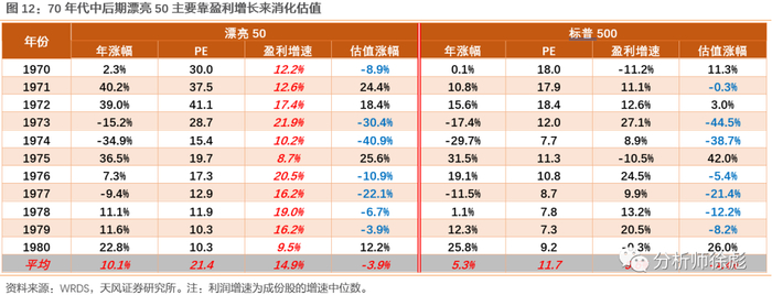 ② 1973.09-1977.04估值消化阶段,漂亮50上涨-29%,标普500上涨-5.5%;