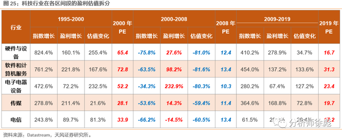 (1)在1995-2000年的上涨阶段:涨幅前五的均是科技行业,其中,硬件与设备+824%、软件和计算机服务+761%、电子电器设备+473%、传媒+279%、电信+244%;而这些科技行业的PE估值分别达到65.4、72.8、52.2、28.1、33.9倍。