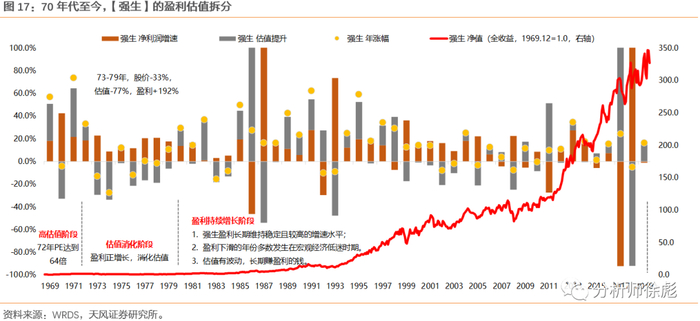 (2)主要靠盈利增长消化估值。70年代初期麦当劳、强生、可口可乐的估值峰值分别达到85倍、64倍、48倍,到了79年,三者的估值分别下跌至9.6倍、14.1倍、10.3倍。73-79年,麦当劳股价-42%,估值-89%,盈利+183%;强生股价-33%,估值-77%,盈利+192%;可口可乐股价-41%,估值-78%,盈利+121%。但80年之后,三者股价均在盈利驱动下开启了跨世纪的腾飞。