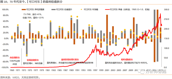 (3)以麦当劳、强生、可口可乐为例:73-79年估值消化阶段,麦当劳股价-42%,估值-89%,盈利+183%;强生股价-33%,估值-77%,盈利+192%;可口可乐股价-41%,估值-78%,盈利+121%。但随后,三者在盈利驱动下开启了跨世纪的腾飞。1970-2019年,麦当劳、强生、可口可乐的涨幅为1164倍、334倍、264倍。
