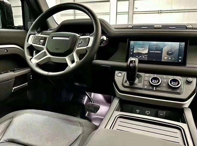 内饰方面,全新卫士基于模块化布局和结构主义设计,体现多功能性及实用性。中控区域使用一体化涂装镁合金横梁,极大提升了整体车身结构强度。新车使用了全新的四辐式方向盘、12.3英寸全液晶仪表、10英寸中控屏幕,空调旋钮带有液晶显示屏,电子挡把位于中控屏下方,使用更加顺手。