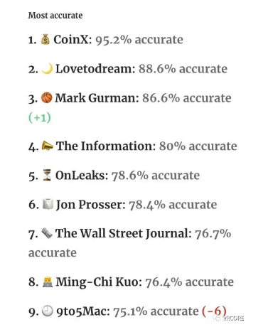 两位大神均是苹果的专业爆料户,根据机构统计,两者爆料的准确程度分别为78.6%和76.4%,可谓是不分上下,但对于苹果AR眼镜的爆料,两者在时间上产生了分歧。