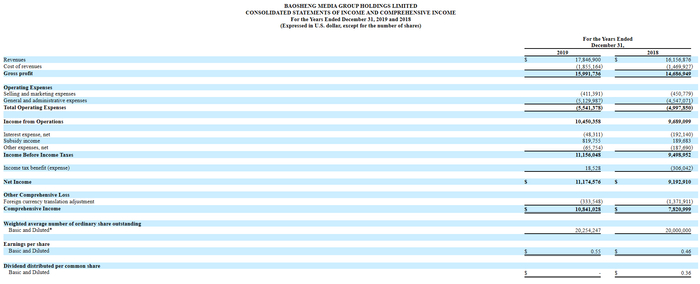 盈利方面,2018及2019年,宝盛科技净利润为919.29万美元及1117.46万美元,2019年净利润增长了约21.6%;2018及2019年,公司净利率分别为56.9%和62.6%;同期,毛利润为1468.69万美元及1599.17万美元,毛利率分别为90.9%及89.6%,虽然2019年公司毛利率有所下降,但是仍为较高水平。