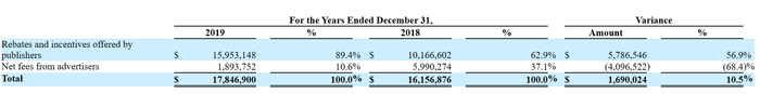 资本邦注意到,报告期内宝盛科技的营收模式较为单一,对出版商回扣及奖励营收的业务依赖度较高,且有增长趋势。2018及2019年,宝盛科技营收为1615.69万美元及1784.69万美元。其中,来自出版商回扣及奖励营收为1016.66万美元及1595.31万美元,占营收的62.9%及89.4%。与此同时,另一项广告主业务在2018年及2019年的营收占比分别为37.1%及10.6%,下滑明显。