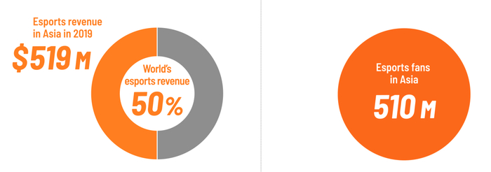 从 NikoPartners 发布的数据来看,全球电竞收入的主力在亚洲:2019 年,亚洲电竞粉丝数约为 5.1 亿人,产生电竞收入约为 5.19 亿美元,约占全球电竞总收入的 50%。