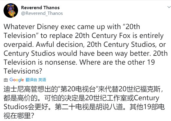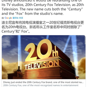 还有人认为,迪士尼的更名“20th Television”(第二十电视,暂译)也很值得吐槽。首先,既然改名,为何不改成21世纪,而是要保留20这个数字?其次,网友指出,迪士尼抹去“世纪”字眼也让人摸不着头脑:“既然是第20个电视,那其他19个在哪里?”