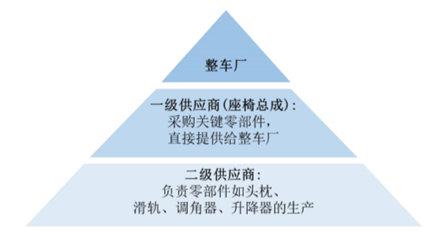 我国汽车座椅零部件行业产品供应链中,一级配套供应商直接向整车厂供应座椅总成系统,二级配套供应商是一级供应商的上游企业,主要为座椅总成商提供座椅骨架、调角器、滑轨等零部件。