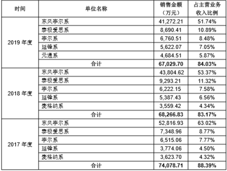 报告期内,公司向前五大系客户的销售额占当期主营业务收入的比例分别为88.39%、83.17%、84.03%;对东风李尔系和李尔系销售额占当期主营业务收入的比例分别为70.79%、60.95%、62.63%,占比颇高。